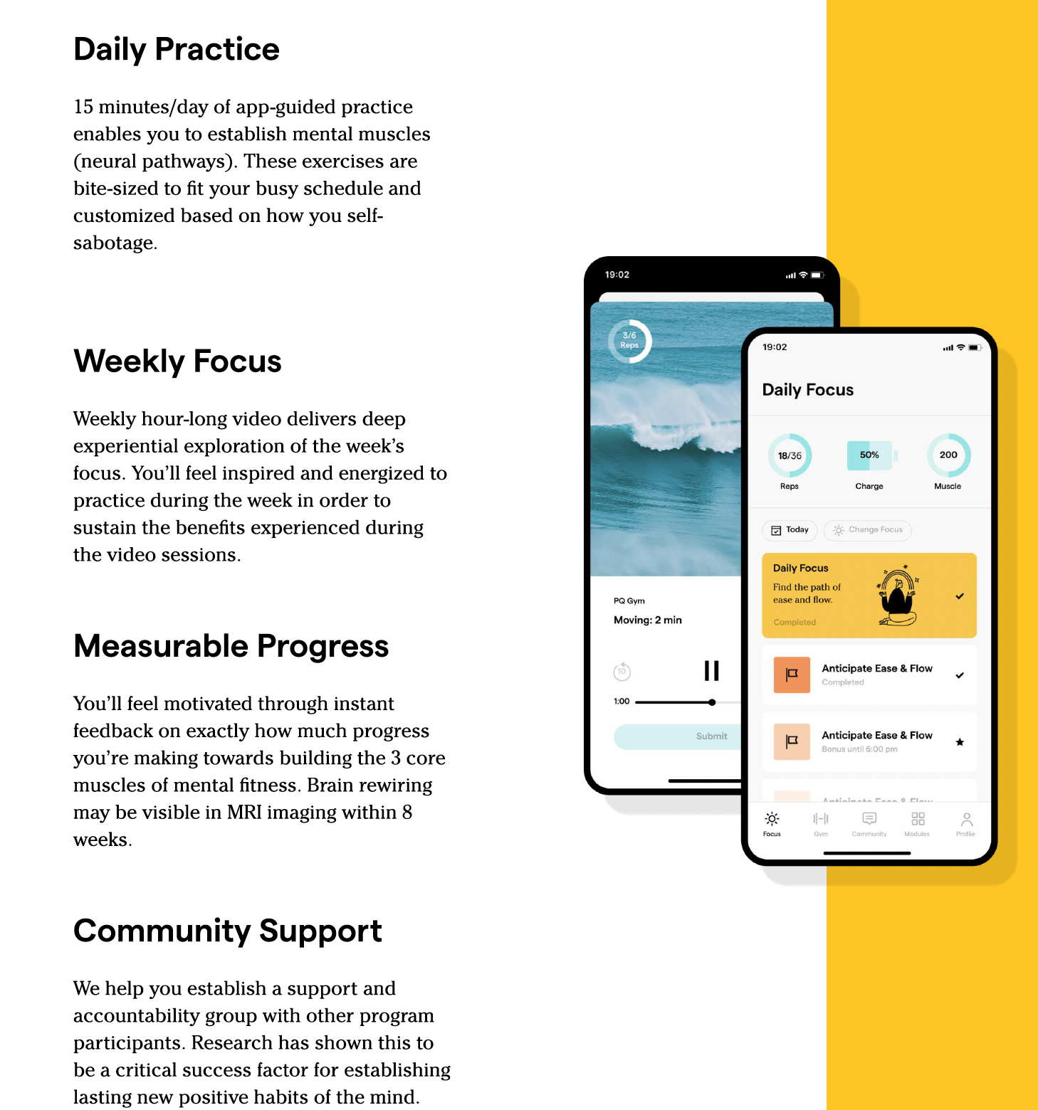 You'll be watching a 1-hour video once per week & doing a combined total of 15 minutes per day of practice guided by the Positive Intelligence app which is exclusively designed for this program.