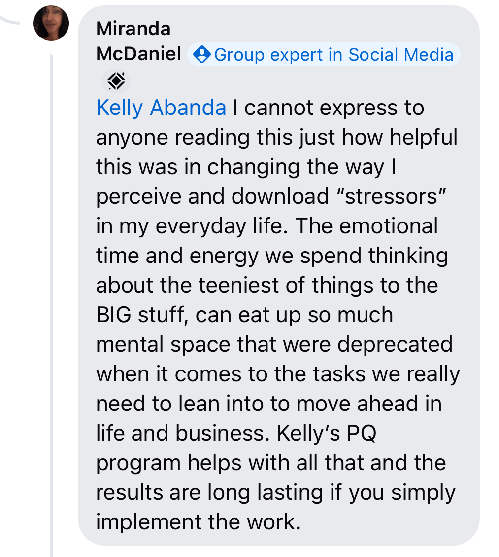 Kelly Abanda will be your PQ Coach (TM)- she'll facilitate your pod for the duration of the program.